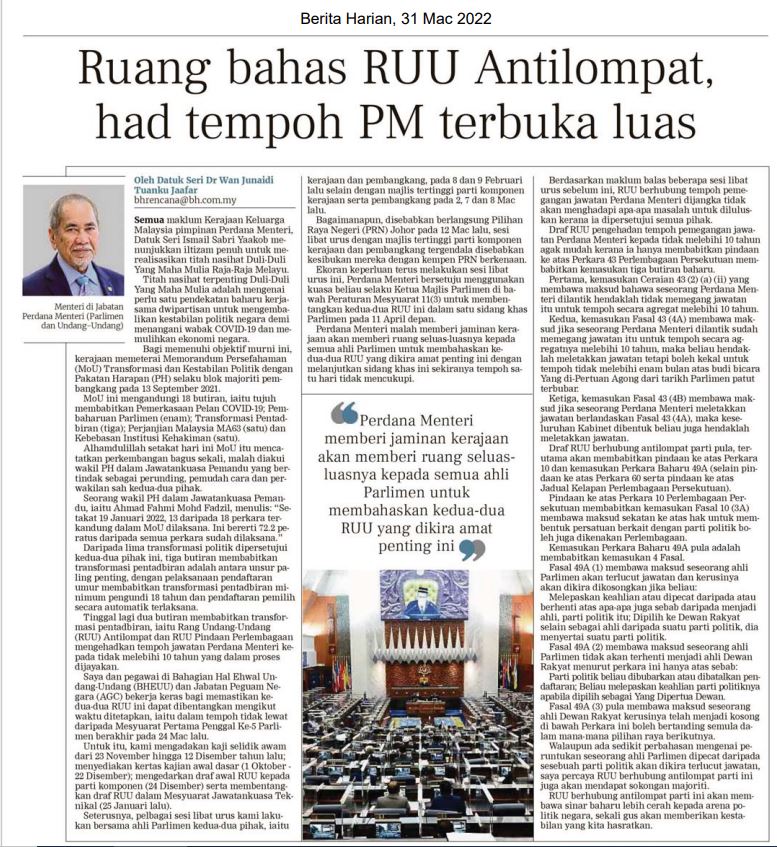 Ruang bahas RUU Antilompat, had tempoh PM terbuka luas