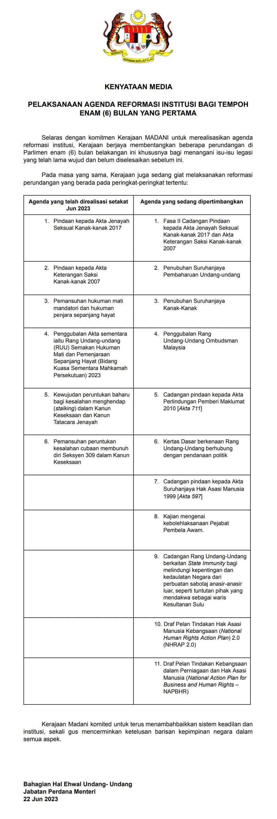 KENYATAAN MEDIA - PELAKSANAAN AGENDA REFORMASI INSTITUSI BAGI TEMPOH ENAM (6) BULAN YANG PERTAMA